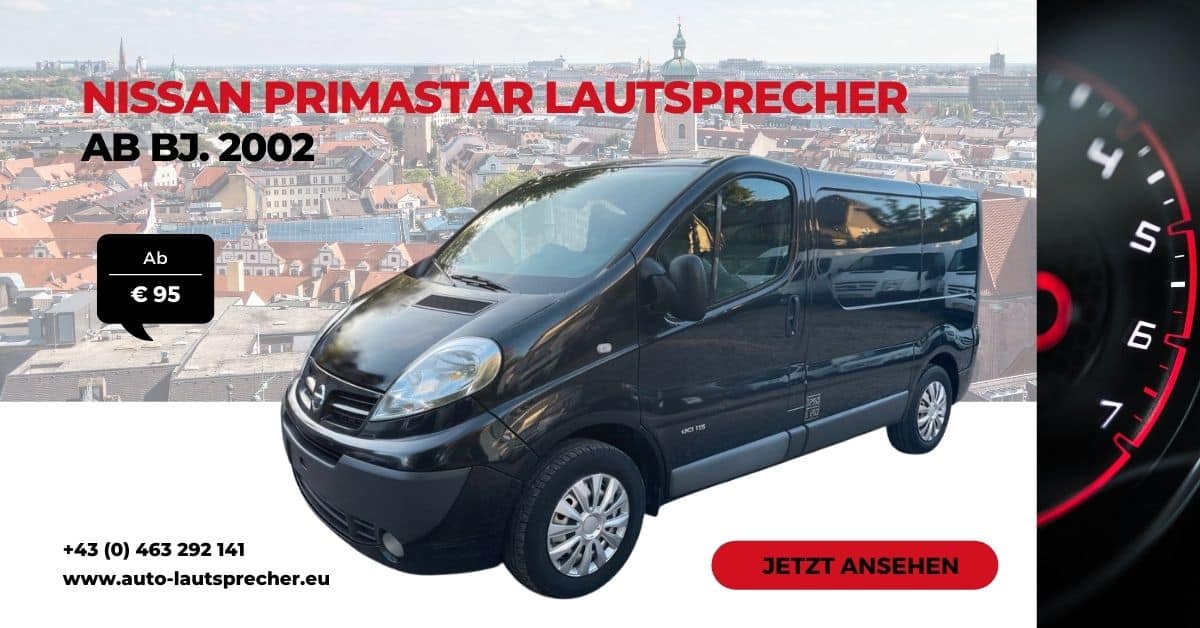 Ein schwarzer Nissan Primastar mit Top-Audiotechnik, ideal für klare Klangqualität im Fahrzeug, ab 95 € bei auto-lautsprecher.eu.