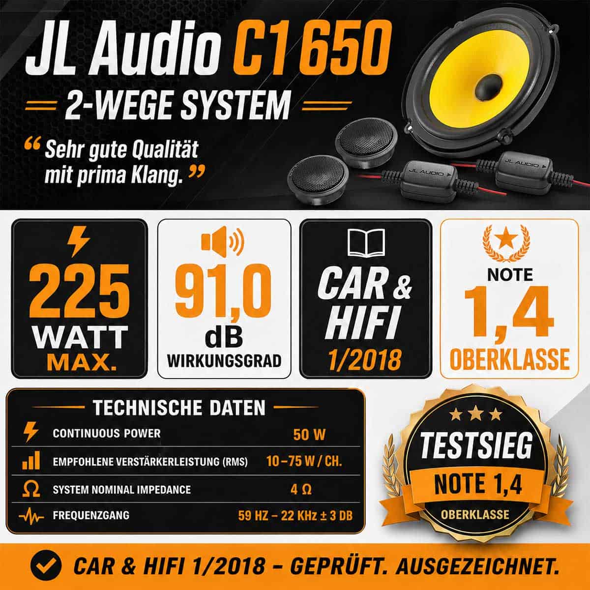 VW Golf V Lautsprecher Front Set mit JL Audio C1 650 2-Wege-System, 225 Watt Max., Einbauringen und Adapterkabeln. Passend für Golf 5 ohne Dynaudio.